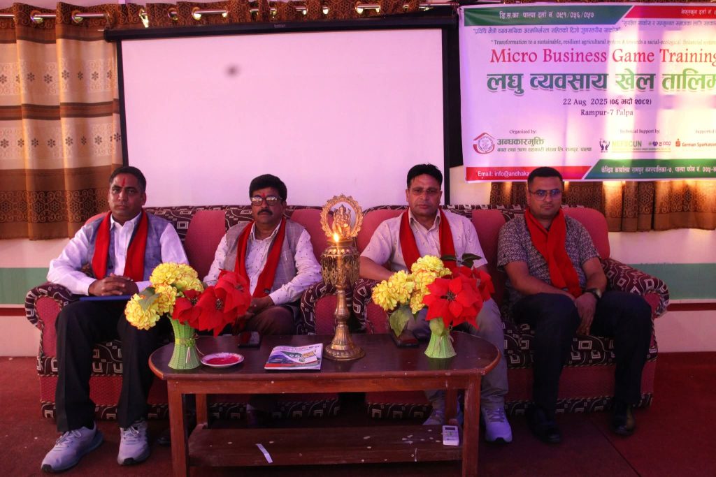 अन्धकारमुक्ति साकोसका अध्यक्ष सागर प्रसाद देवकोटाको अध्यक्षतामा भएको कार्यक्रम रामपुर नगरपालिकाका प्रमुख रमण बहादुर थापाको प्रमुख आतिथ्यतामा भएको हो । तालिमको शुभारम्भ गर्नु हुँदै नगर प्रमुख थापाले आर्थिक समृद्धिका लागि व्यवसाय महत्वपूर्ण रहेको बताउनुभयो । कुनै पनि व्यवसाय सही व्यवस्थापन गर्न सके मात्र सफलता प्राप्त हुने बताउनुहुँदै थापाले तालिम बाट प्राप्त सिपको सहि सदुपयोग गरी अघि बढ्न समेत आग्रह गर्नुभयो । रामपुर नगरपालिकाले नगरबासीलाई व्यवसाय प्रति आकर्षित गर्न युवा स्वरोजगार कार्यक्रम मार्फत व्याज अनुदान प्रदान गर्दै आएको बताउनुभयो । साना उद्यमीलाई लक्ष्यित गरी नगरपालिकाले दुई वर्षका लागि ३० लाख सम्म व्याज अनुदान वितरण गर्दै आएको जानकारी दिनुभयो ।