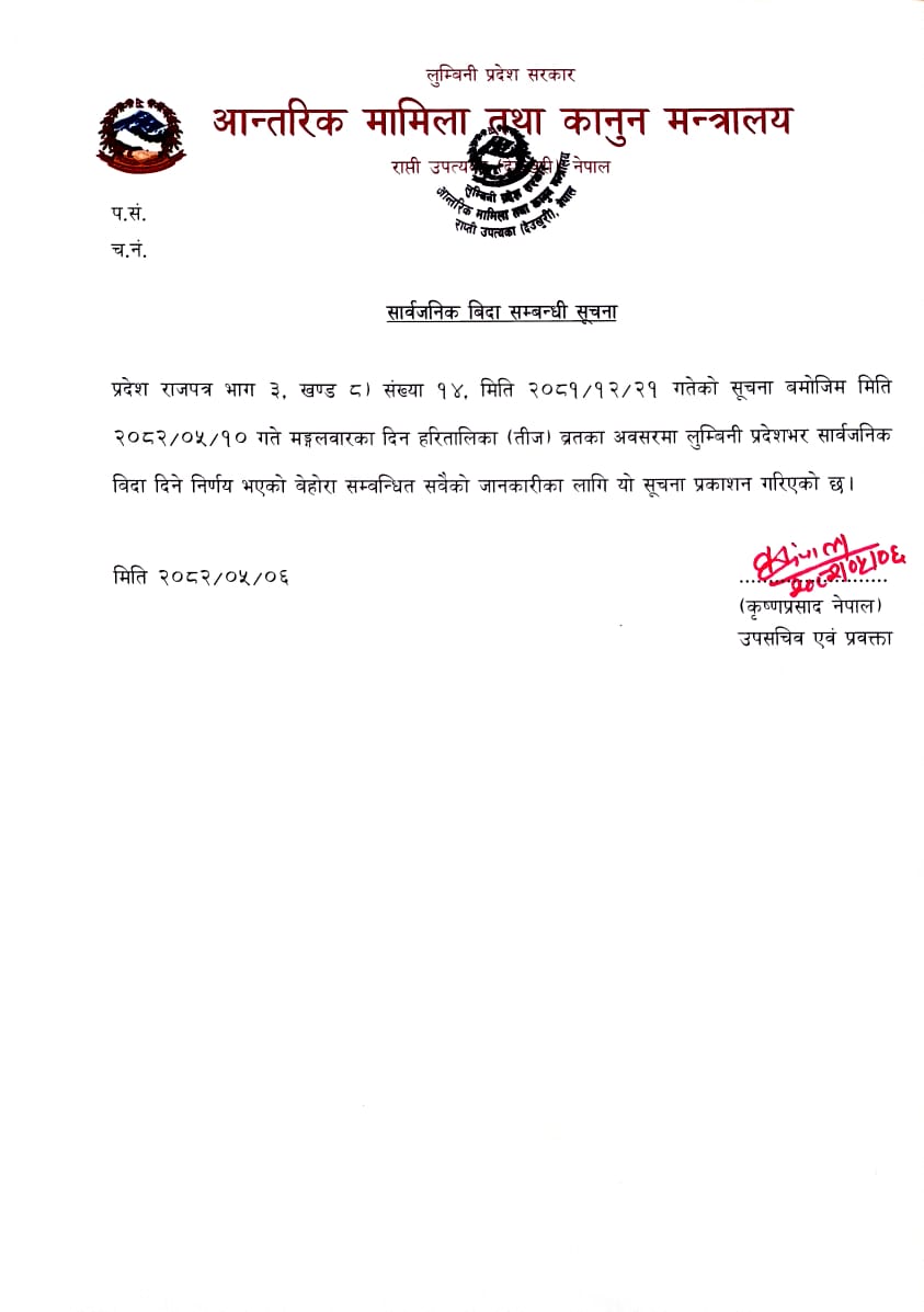 आज लुम्बिनी प्रदेश आन्तरिक मामिला तथा कानुन मन्त्रालयले लुम्बिनी प्रदेशभरका सरकारी तथा गैर सरकारी कार्यालयहरूमा सार्वजनिक विदा दिएकाे छ । नेपाल सरकारले भने तीजमा महिला कर्मचारीहरूलाइ मात्र बिदा दिदै आएकाे छ ।