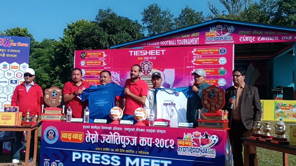 पाल्पा — रामपुरमा भोलि आइतबारदेखि सुरु हुन लागेको वाइवाइ तेस्रो ज्योतिपुञ्ज कप फुटबल प्रतियोगिता का सबै तयारी पूरा भएका छन्। जिल्ला कै सर्वाधिक पुरस्कार राशी सहितको यो प्रतियोगिता आगामी कार्तिक ३ गते सम्म सञ्चालन हुनेछ। आयोजक ज्योतिपुञ्ज युवा क्लब ले शनिबार पत्रकार सम्मेलनमार्फत सम्पूर्ण तयारी पूरा भएको जानकारी दिएको हो।