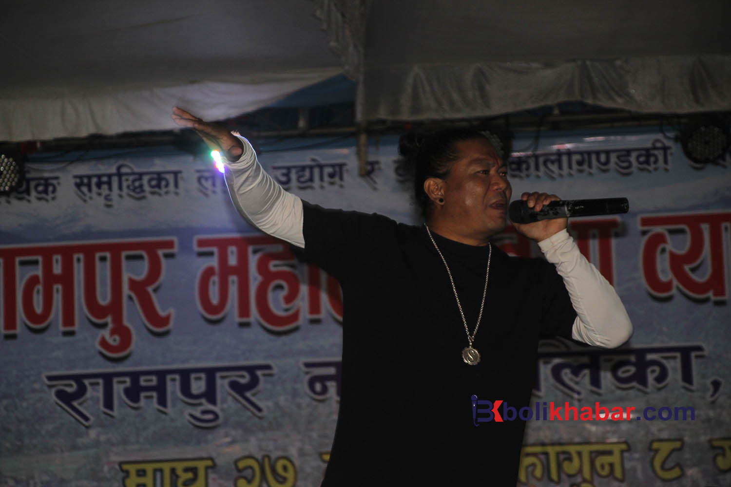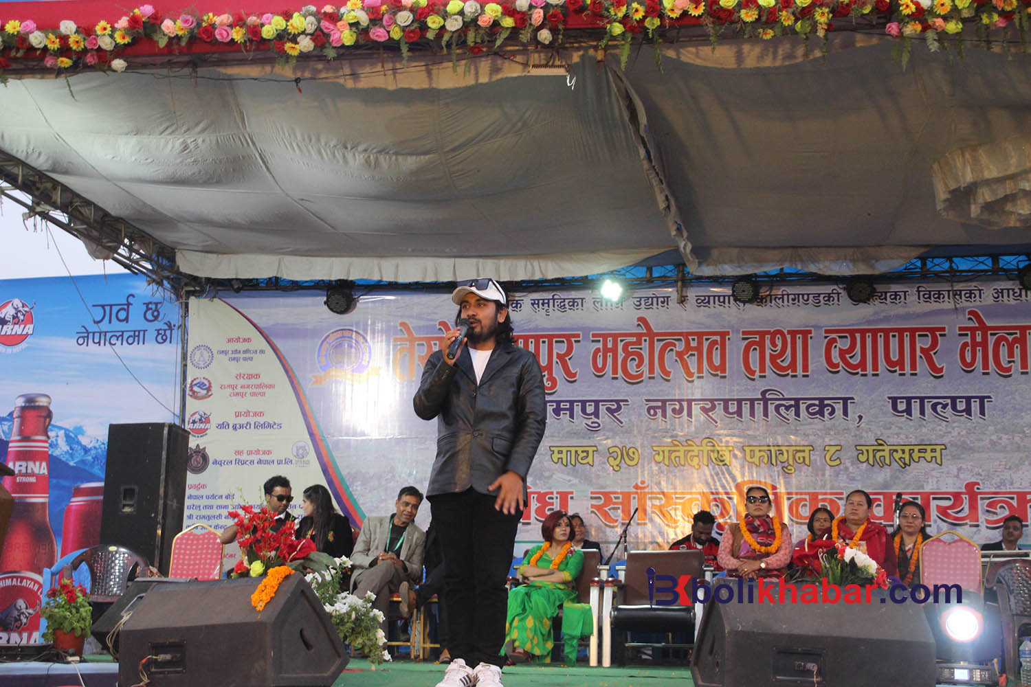 पाल्पा । पाल्पामा जारी तेस्रो रामपुर महोत्सव तथा व्यापार मेलाको छैठौं दिन बुधबार चर्चित लोक तथा दोहोरी गायक खेम सेन्चुरीले दर्शकलाई भरपुर मनोरञ्जन दिए ।